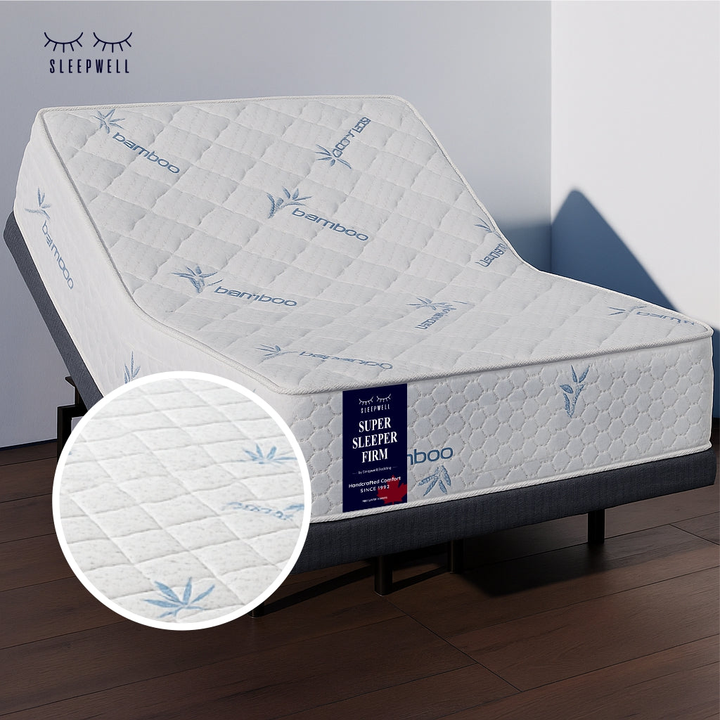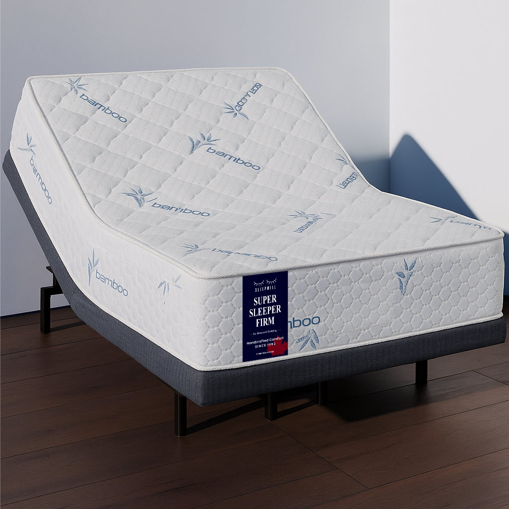 Enjoy dependable support on both sides with the Super Sleeper Firm—crafted for those who prefer a firmer feel with added versatility. The tight-top, double-sided design extends mattress lifespan, while the breathable bamboo fabric keeps your sleep environment cool, dry, and fresh. Engineered to be fully compatible with adjustable bases.